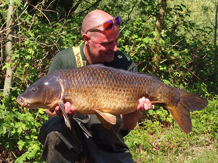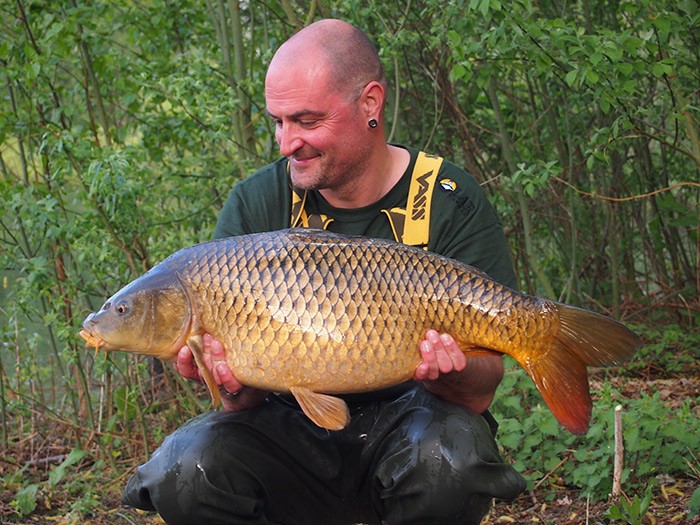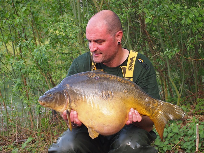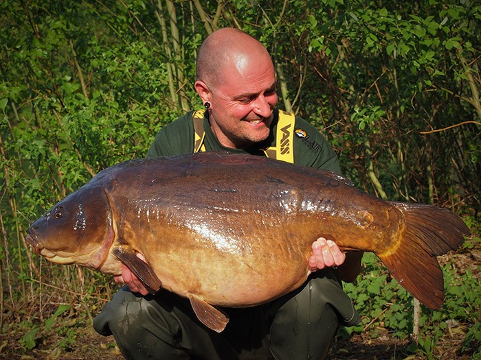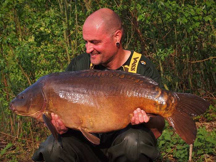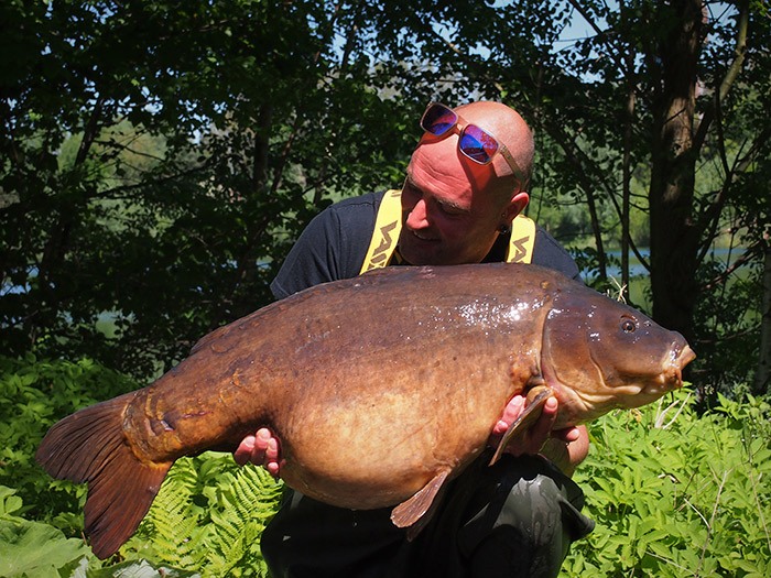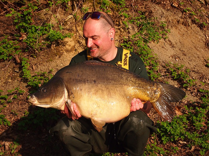 Vroeg in de morgen werd ik gewekt door de zoveelste brasem. Nu had ik het wel gehad met die slijmjurken en ging de hengel richting de plek waar gisteren de vis sprong. Zo gezegd zo gedaan, en net als gisteren vlogen er wat Club boilies dezelfde kant op. De waker was nog maar net in positie gebracht of deze knalde al tegen het carbon. Ik kon mijn ogen bijna niet geloven wanneer dezelfde grote spiegel van enkele weken geleden weer op de mat ligt. Ongelofelijk!