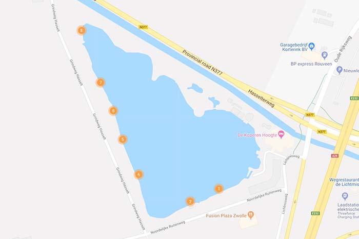Plattegrond van de Koperen Plas. Shimano vind je op stek 1 en 2.