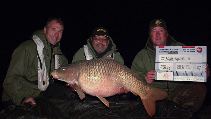 Nadat we telefonisch contact hadden met de mannen van het Sonik Sports team 2, bleven ze ons op de hoogte houden van hun sessie. En goed nieuws: de eerste vis is op de kant gekomen! Een brute schub van maar liefst 18,43 kilo belandde op de mat. Omdat de zwaarste drie vissen tellen, kan het nog alle kanten op met de wedstrijd!