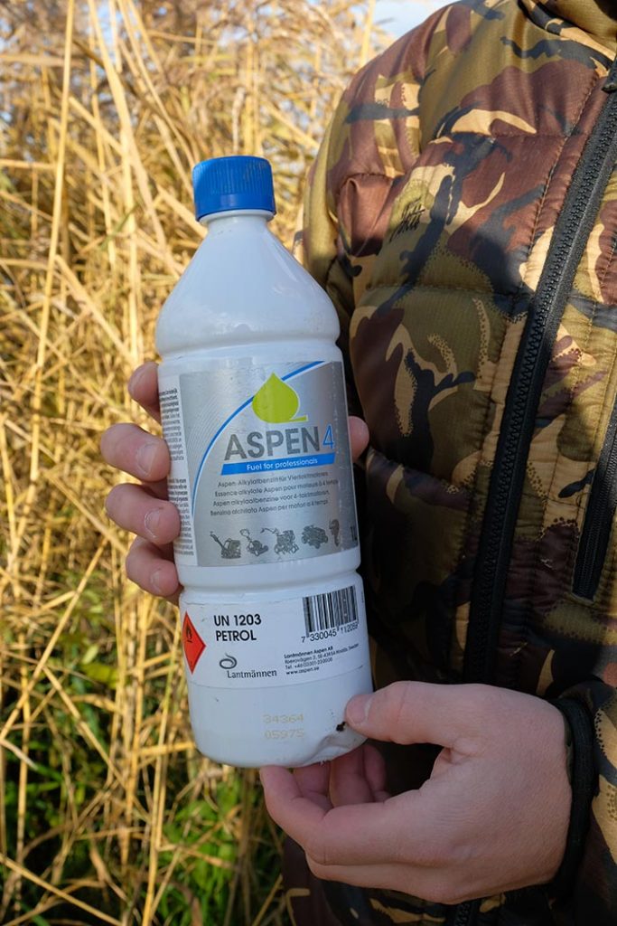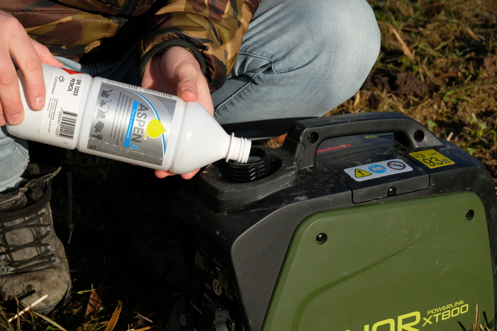Beter is dus om te werken met een brandstof die veel minder vervuilend en schadelijk is voor de motor van de aggregaat. Na veel rondvragen en lezen voor gebruik heb ik ervoor gekozen om te kiezen voor Aspen4. Dit is een alkylaatbenzine speciaal ontwikkeld voor 4takt motoren zoals de Thor Powerline XT800. Daarnaast zijn de uitlaatgassen van deze brandstof vrijwel reukloos en minder gevaarlijk voor je gezondheid mocht de wind net even niet lekker staan.