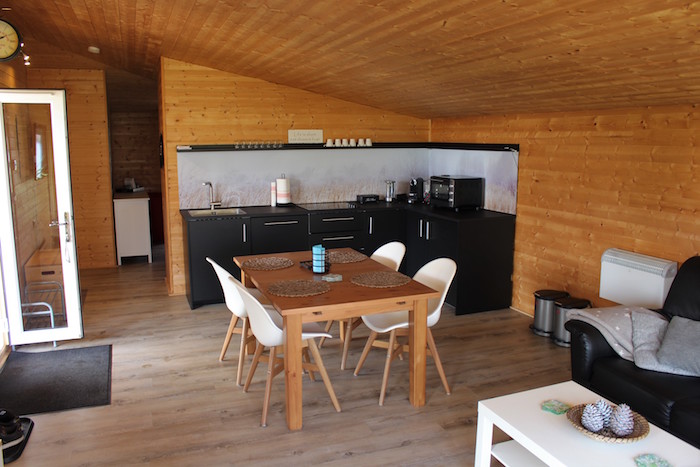 Er is zelfs een luxe keuken met alles er op en er aan. Je hebt de beschikking over een eettafel met vier stoelen, een koelkast met vriesvak, een magnetron, vaatwasser, koffiezetapparaat, waterkoker, kookplaat met plaats voor vier pannen en stromend water. Zowel warm als koud. Maar let op! Dit water is NIET drinkbaar. Je moet zelf vanuit de supermarkt voor drinkwater zorgen.