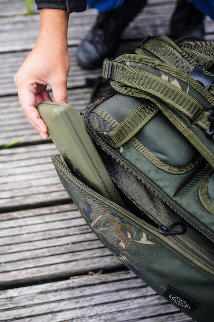 De Recon Rucksack is verder voorzien van straps waar je je bankstick met beetmelder aan kunt bevestigen. Vis je veel op steigers of stenen ondergronden waar het plaatsten van banksticks niet mogelijk is, dan kun je de rugzak dus zelfs als rodpod inzetten! Daarnaast beschikt de rugzak over een EVA Bivvy Tray die als tafeltje dienst doet. Ideaal om je rig, schaartje en/of ander materiaal op klaar te leggen, of om je bakje koffie op te zet 😉