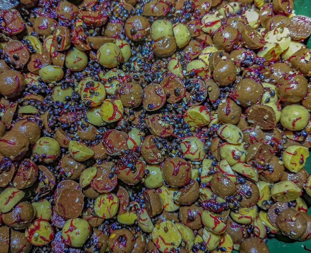 Denk er ook eens over na om verschillende maten aas te gebruiken. Als je bijvoorbeeld alleen maar twaalf millimeter boilies of hennep voert, geef je de vis de kans om monotoon te azen. Hij gaat op je voerstek liggen en kan alles moeiteloos naar binnen zuigen. Gebruik je verschillende formaten aas, dan verplicht je de vis om iedere keer van positie te veranderen om zo zijn buik rond te eten. Dit komt je ten goede tijdens de inhaking. Ik zal ook nooit met bollen bijvoeren als ik met een ronnie rig vis.