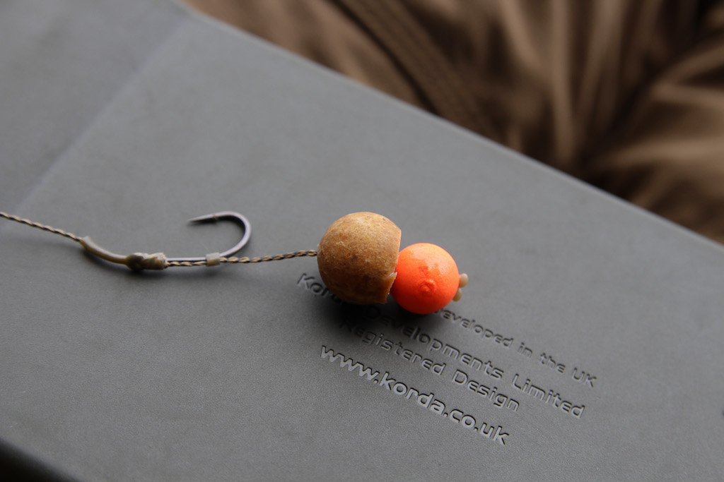Dat is een curve haak maat vier van Carp Whisperer, een medium kicker en een soepele onderlijn van ongeveer acht tien centimeter. Het voordeel van deze rig is, dat de bol bij het uitspugen meteen naar achteren valt waardoor de haak agressief inhaakt. Om het visueel iets aantrekkelijker te maken zet ik er twee clusters nepmaden op. In de afgelopen jaren heeft deze rig mij al heel veel vissen opgeleverd. Dus zeker het proberen waard.