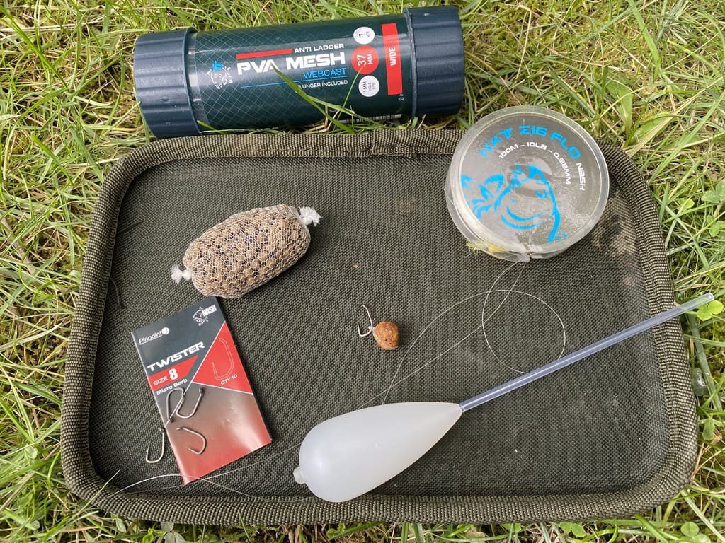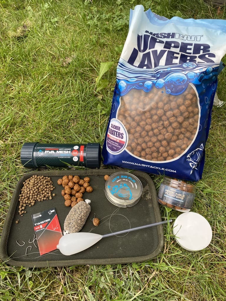 Ik gebruik vaak een mix van riser pellets en slicker pellets om te voeren. Als haakaas gebruik ik veelal de hookable floaters. Deze kunnen op de haak worden geprikt met de punt van de haak vrij. Ik bevestig ze het liefst onder de haak middels een hair, of nog beter een bait elastiekje. Ook de plastic zig screws bieden uitkomst om snel te starten met vissen.