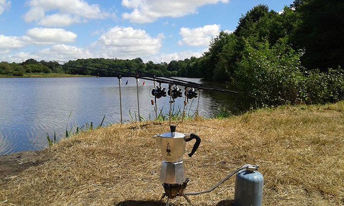 Ik zou hier natuurlijk moeten zeggen: “Mijn Ashima haken en Mainline boilies.” Maar ik ga toch zeggen dat ik NIET kan zonder een verse bak koffie in de ochtend. Mijn brander en koffiemok gaan dus ook altijd mee!