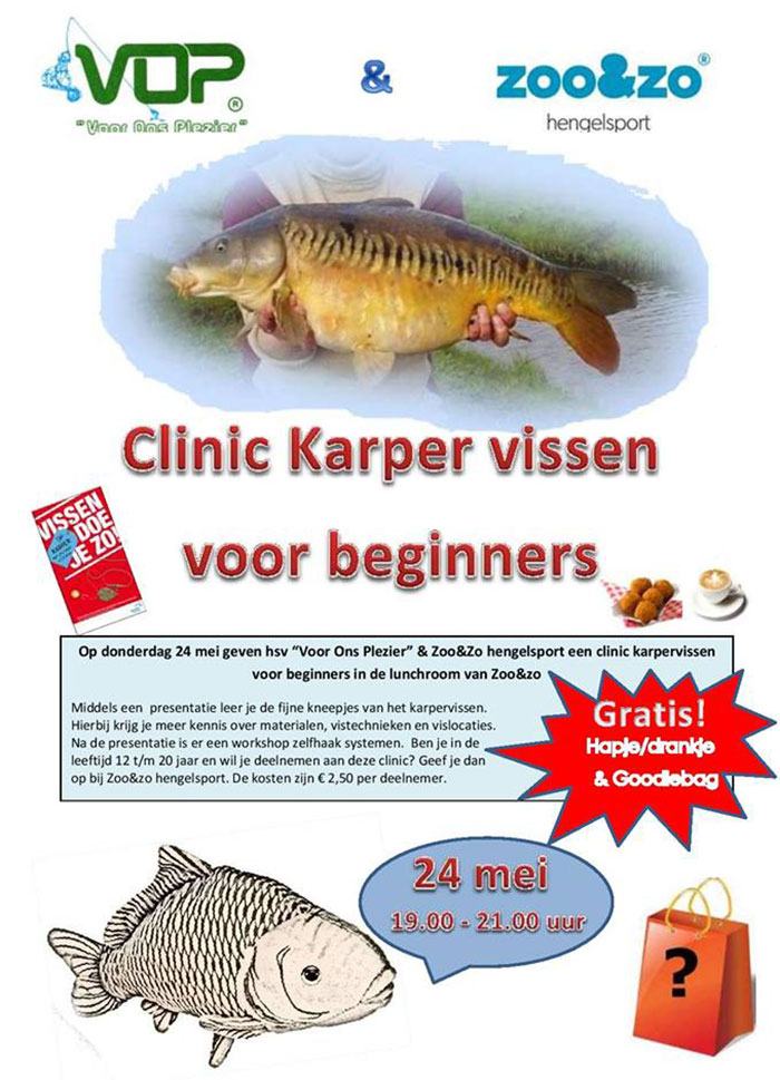 Speciaal voor de jeugd (12 tot 20) organiseren Visvereniging ?voor ons plezier? en ZOO&ZO Hengelsport op donderdag 24 mei tussen 19.00 en 21.00 een clinic ?karpervissen voor beginners?. Tijdens deze informatieve avond krijg je antwoord op al jouw visvragen en ontmoet andere vissers van jouw leeftijd en niveau. Je gaat naar huis met alle informatie over karpervissen n met een rijkelijk gevulde goodiebag.
