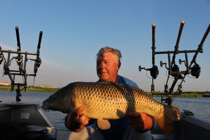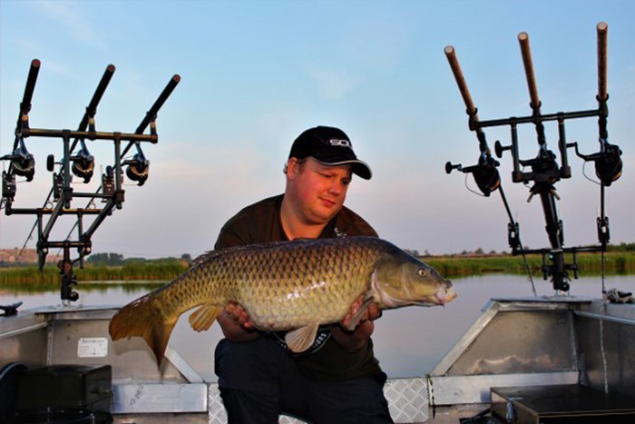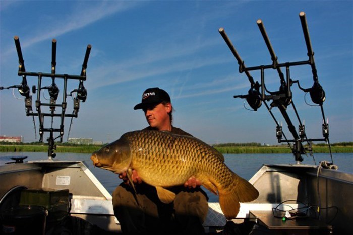 Na deze eerste karper volgde de aanbeten elkaar in rap tempo op. Tot een uur of 10 kwamen er nog vier karpers op de mat, stuk voor stuk schubs, varirend tussen de 7 en 15,8 kilo. De grote schub zwom zich onder de boot vast om de steekstokken, maar gelukkig kregen we de vis nog los!