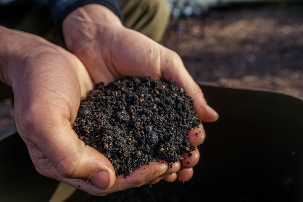Na het water verkend te hebben met de rubberboot, dieptemeter en prikstok ben ik terug op de kant om mijn vertrouwde grondvoermix klaar te maken. Ik mix gemalen Choquita boilies, bag & stickmix, micro pellets in combinatie met minamino+ en een paar handjes mini boilies. Deze mix is zeer donker van kleur en zal daardoor goed matchen met de blubberbodem. Dit zorgt ervoor dat het zo min mogelijk aandacht trekt van de watervogels.