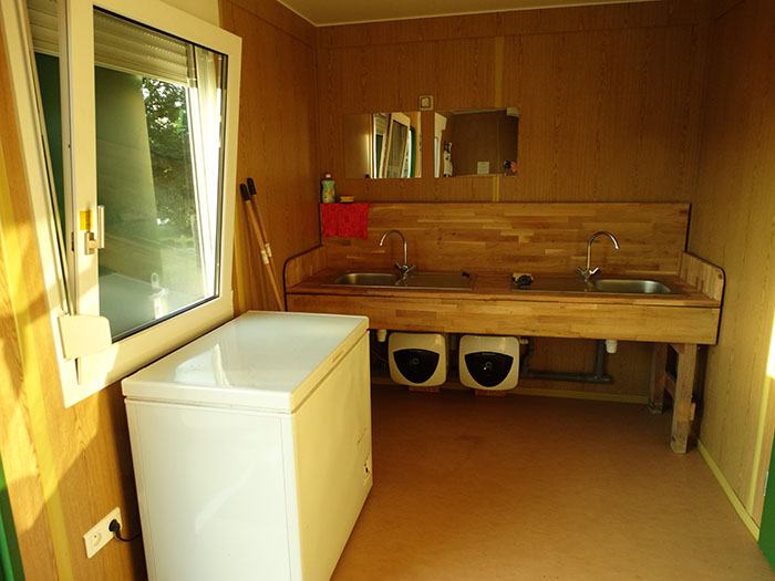 Bij het woord sanitair gebouw denk je misschien niet meteen aan een portacabin. Maar, eenmaal binnenin deze portacabin, werd mij duidelijk dat dit geen gewone is waar je normaal de schilders in ziet zitten op een bouwterrein. Het sanitair en de keuken voor de klanten is samengevoegd tot een luxe ‘karperkeet’.