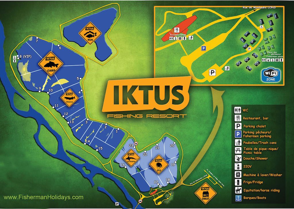 Het Iktus visvakantiepark is zichtbaar keurig aangelegd en bij binnenkomst zie je direct rechts het water Iktus Sturgeon en links de tackleshop annex receptie waar je bij aankomst kan melden. Het vakantiecomplex is afgesloten en veilig. In de verte kronkelt een rivier en de mensen die we er zien, gezinnen en vismaten hebben het duidelijk naar hun zin. We worden direct hartelijk ontvangen door Jérémy, Ludovic die zichzelf manusje van alles noemt en Laurent die de tackleshop runt. Voor een sfeerimpressie van het water klik hier.