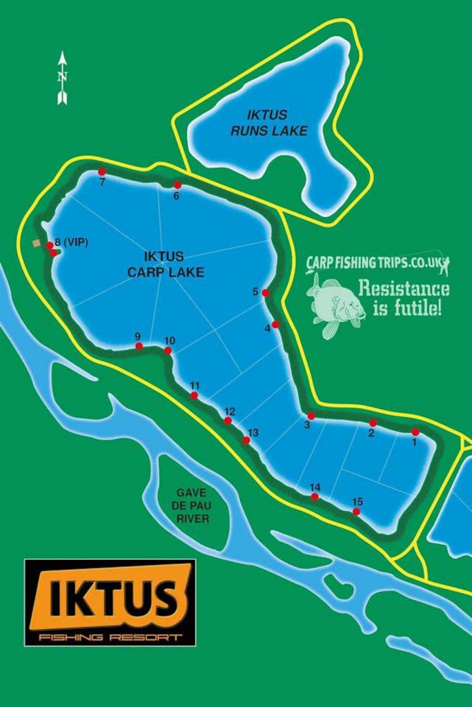 Het Iktus Carpe domein is in totaal maar liefst 100 hectare groot, bestaat uit drie meren en is gelegen in een soort van parkachtig natuurlandschap. Voor alle drie de wateren is er een eigen specifieke doelgroep en hiermee voor elk wat wils. Iktus Sturgeon is er voor de fervente steurvisser, Iktus Run voor de visser die vooral houdt van veel vangen en vaak actie en Iktus Carpe. Iktus Carpe is ongeveer 35 hectare groot en staat bekend als een absolute aanrader voor de fanatieke karpervisser. Het water is gelegen op ongeveer 1200km van Breda aan de voet van de Pyreneeën tussen de stad Pau en de rivier de Gave. De omgeving is sprookjesachtig. Het water is zo gesitueerd dat je er prachtig uitkijkt over de Pyreneeën en de vele bossen en bergen die het gebied rijk is. Je ziet en voelt de rust en ruimte. Bij aankomst komen we dan ook direct in een fijne vakantiestemming. De ontspanning begint direct en alle inspanning van de reis valt direct van ons af.