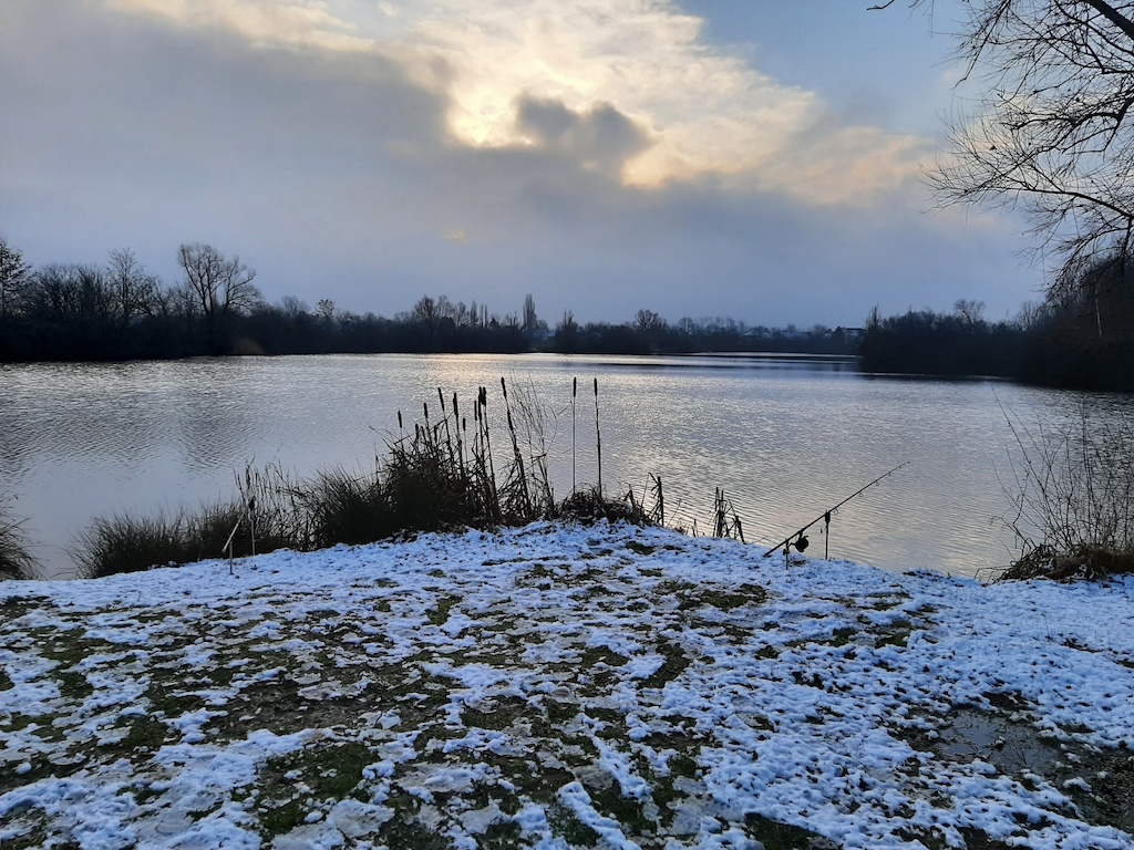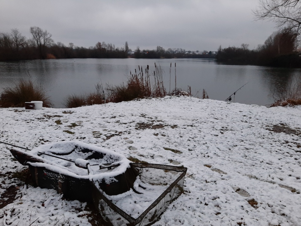 De eerste sessie op het syndicaat vindt plaatst in januari. Koude noordenwind, overdag vriest het net niet, watertemperatuur van twee graden, weinig lichturen …. Echt hoopgevend is het allemaal niet. Maar de drang om die eerste keer te vissen op het desbetreffende water is sterker dan mezelf. Drie ronnies worden op verschillende dieptes op scherp gelegd, allen voorzien van een vijftien millimeter fluo pop-up. De uren verstrijken zonder ook maar een teken van leven. Dan maar vroeg onder de wol en wat rondneuzen op sociale media “lang leve de KWO app“. Na een ijskoude nacht ontwaken in een met sneeuw bedekt landschap zorgt toch wel voor idyllische taferelen. Ik pak in en ben direct weg, de eerste karper van het jaar laat voorlopig nog op zich wachten.