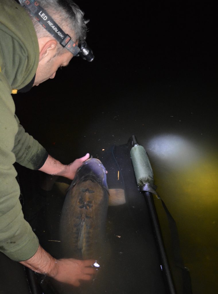 Uit het niks schiet de linker hengel ervandoor. Omdat ik strak tegen obstakels lig te vissen moet ik de vis flink afblokken om hem niet te verspelen. Als ik de vis op een paar meter van de overkant weet weg te trekken, begeef ik me met de boot richting de vis. Na een korte maar zeer krachtige dril ledigt de strijder aan de andere kant van de lijn zijn zwemblaas. Waardoor er een grote bellenplakkaat het wateroppervlak doorbreekt. Met één poging weet ik de vis te netten en wonder boven wonder is het de vis waar ik mijn zinnen op had gezet, “de grijze spiegel“. Na de fotoshoot mag hij terug in zijn natuurlijke habitat. Hopelijk kan hij nog een beetje doorgroeien in de toekomst.