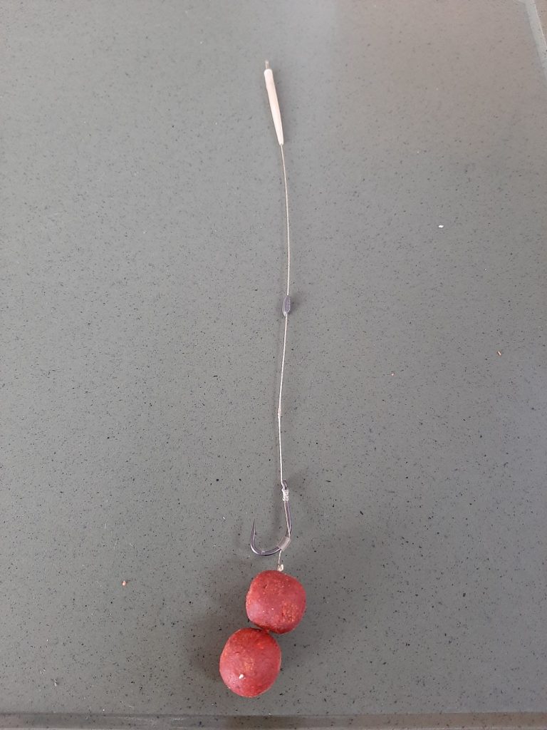 Een echte topper uit het gamma die het op dit water uitstekend doet, gepresenteerd aan een uiterst simpele rig die ik altijd vol vertrouwen inzet op elk type water. De rig bestaat uit een haakmaat 4 TNT-Gladiator die door middel van de alombekende knotless knot geknoopt wordt aan een 15 tot 20 cm stukje Jelly-Wire van PB products. Verder gebruik ik enkel een stukje silicone tube om de hair te fixeren rondom de haaksteel. Als ik merk dat ik vissen begin te verspelen omdat ze slecht gehaakt worden, zal ik wel een line aligner in de strijd gooien om zo de haaksteel te verlengen wat de inhaking zal bevorderen.