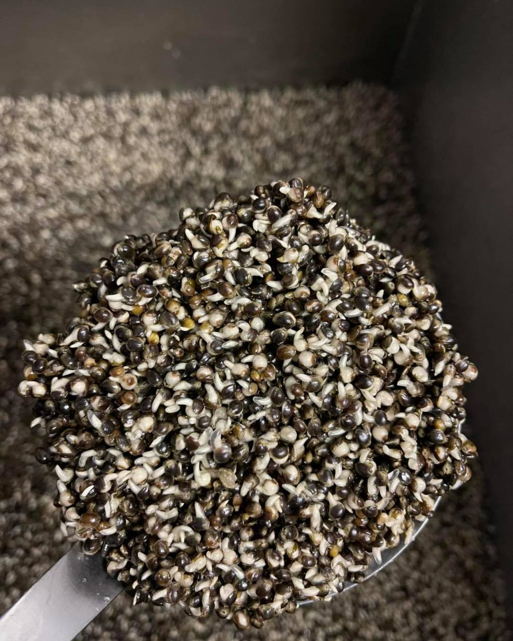Net zoals op de Great Lake was dat wederom met witte pop-ups op Spinner Rigs boven op een lading hennep. Ik hoop dat die fluo pop-up de aandacht trekt van de vis voordat ze eigenlijk helemaal losgaan op de hennep. Dat tapijt aan kleine, veilige korrels hennepzaad is echt om de aandacht te trekken van de vis. Als ik ergens begin met voeren start ik daarom ook vrijwel altijd met hennep. Zelfs als ik bijvoorbeeld ergens met boilies een voercampagne wil opzetten, voer ik de eerste keren ook graag veel hennep bij.