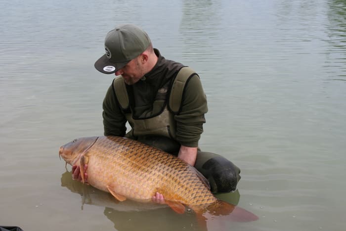 Tot mijn grote verbazing zag ik toch de eerste contouren van een karper. Mijn mond viel open en ik riep het uit naar Hennie. Wat een prachtige schub! Eenmaal aan de kant kon ik amper uit mijn boot komen. Met zijn tweeën stonden we te staren naar de grote lap die in mijn net lag. Wat een vis. Eenmaal in de sling bleef de naald steken op 58 pond, 29 kilo! In één jaar tijd was hij 6 pond aangekomen. Onze Franse vrienden die op de noordkant zaten kwamen delen in de vreugde en ook de eigenaresse was er bij om getuige te zijn van de zwaarste vangst ooit van het domein. Een echte “Fish of a lifetime”!