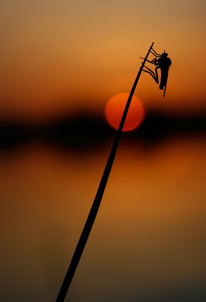 Ik kan enthousiast worden als ik het silhouet van een Machimus Tolmerus Cingulatus (oftewel: Roofvlieg) op een Veldrusspriet zie zitten, die zich aftekent tegen de ondergaande zon. Wat kunnen zulke kleine dingen toch mooi zijn! Ik droom weg bij de onnavolgbare dans van een tweekleurige Parelmoervlinder, die zorgt voor een glimlach van oor tot oor. De vlinder besluit namelijk om plaats te nemen op die ene grasspriet waar de camera op is gericht. Hetzelfde geluk hoop ik te hebben met de Kleine Wijngaardslak. Ik lig vol adrenaline in de blubber te wachten tot het beestje een blik werpt over de rand van de rottende tak waar de camera op is gericht. Deze slak heeft geen haast, net als deze karpervisser!