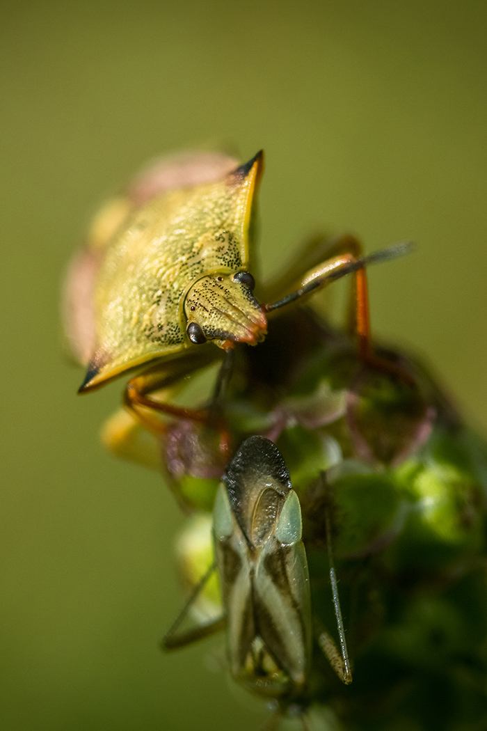 Buiten de mieren om is deze grootse kleine wereld zo divers dat ik met enige regelmaat perplex sta van de verschijningen die ik aantref,gewoon in Nederland! Hoe verzin je het? Hoe is dit ontstaan? Geniaal gewoon! Neem bijvoorbeeld de nimf van een Struiksprinkhaan. De zwarte stippen op het fel groene lichaam met de mega lange voelsprieten; een levend meesterwerkje als je het mij vraagt! Net als het indrukwekkend geblokte en gespikkelde schild van een Meidoornkielwants. Voor mij zijn dit stuk voor stuk kleine momenten van geluk. Precies die kleine geluksmomenten zijn de belangrijkste reden om mijn hoofd telkens weer in het struikgewas telaten verdwijnen, op zoek naar nieuwe interessante verschijningen.