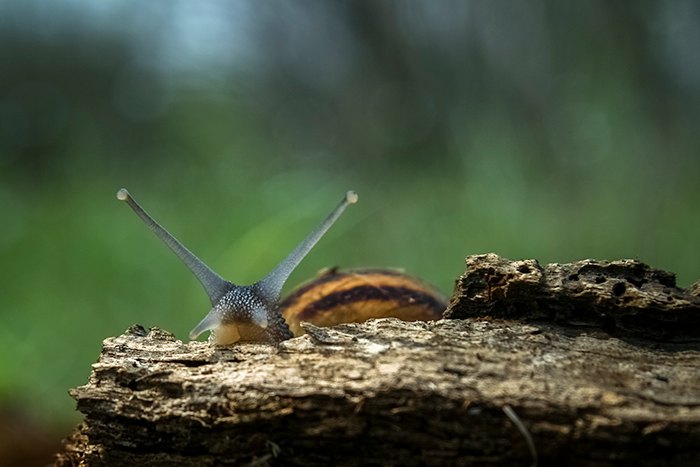 Oncomfortabel maar geduldig blijf ik roerloos liggen. De slak komt langzaam maar zeker binnen schietafstand. Hij is er bijna, nog maar een klein stukje! Met verhoogde hartslag richt ik mijn camera met militaire precisie op het nietsvermoedende slachtoffer. Ik focus snel en plaats voorzichtig mijn vinger op de ontspanknop. Het moment is bijna daar. De slak draait langzaam maar zeker zijn kop richting de lens, nog een stukje verder, nog iets! De zwarte puntjes op de uiteinden van zijn sprieten verschijnen langzaam boven de rand van de tak, millimeter voor millimeter worden ze groter. Nog iets verder en ook de kop doorbreekt de horizon van de tak. Precies zoals ik het voor ogen had, heerlijk gewoon!
