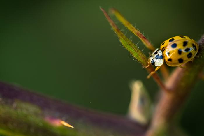 Roel aan het woord:Vol bewondering kijk ik naar een Harmonia Axyridis (oftewel: veelkleurig Aziatisch lieveheersbeestje), die zijn weg vindt over een bramentak vol hindernissen. Waarschijnlijk is hij op weg naar de groep bramenluizen aan het eind van de tak, voor zijn maaltijd. Plotseling wordt mijn aandacht getrokken door de imposante verschijning van een Muskusboktor, die met zijn multifacetogen polshoogte komt nemen van het vreemde wezen dat camouflagekleding draagt en zojuist zijn territorium is binnengedrongen.