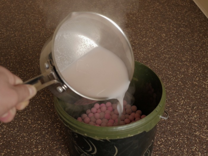 Nadat de Yogo kookt giet je deze over de boilies in de emmer heen en laat je ze vervolgens tien minuten in een afgesloten emmer staan.