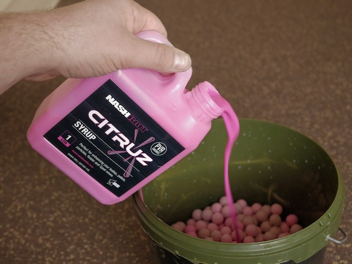 Voeg vervolgen een flinke scheut Citruz Syrup toe en schud de boilies goed door elkaar.