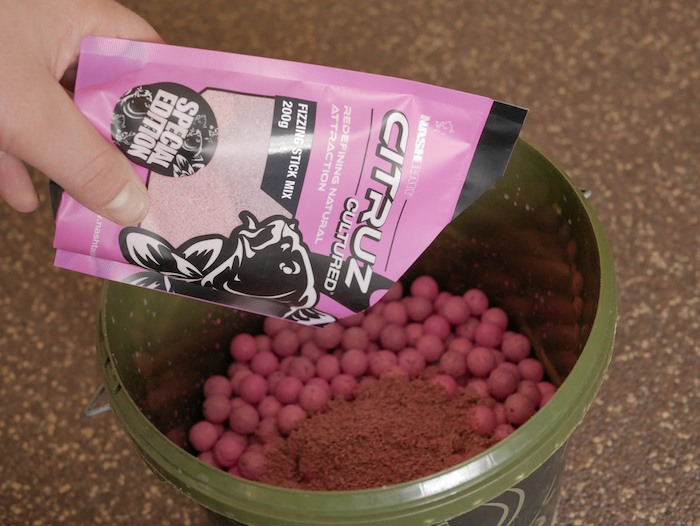 Voeg na wederom een minuut of tien een flinke hoeveelheid Citruz Cultured Fizzing stickmix toe, en hussel ook dit goed door elkaar totdat alle boilies bedekt zijn met een laag stick mix.