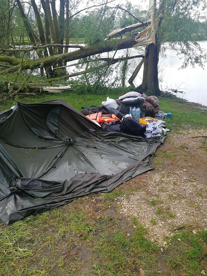 De donder en bliksem kwamen langzaam onze kant op. Twee maten van ons gingen nog snel het water op om een lijn te bevrijden. “Nog even rustig alles in de tent zetten voor de regen” dacht ik. Plotseling stak er een felle wind op met hevige regen, dus ik kroop direct in mijn tent. Binnen enkele seconden veranderde de wind in een wind die ongezien was: je zag geen hand voor ogen meer. Om mij heen braken bomen af als luciferstokjes.