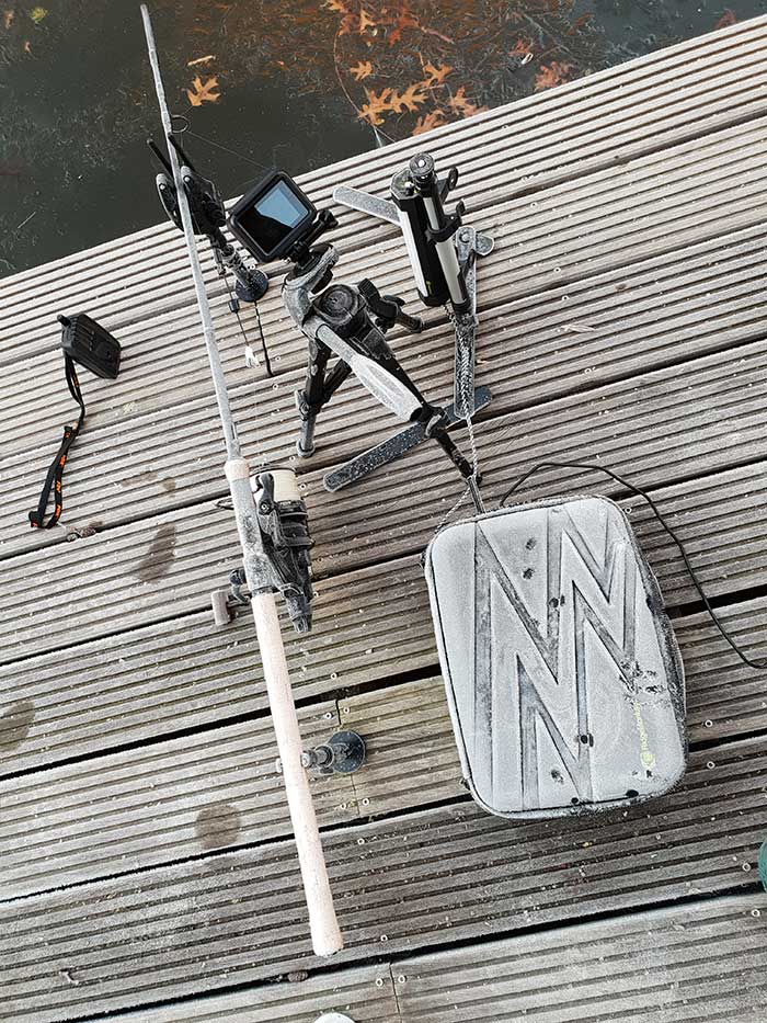 Nachtvorst kan echter wel een probleem vormen bij beetmelders met een wieltje, dat is algemeen bekend. Een ijslaagje of vastvriezen kan gewoon voorkomen, met name als er veel vocht is zoals dauw, mist, ijzel of een pak sneeuw. Ik weet dat sommige vissers eenmaal per jaar hun beetmelders inspuiten met teflonspray om dit te voorkomen. Ik heb echter geen voorzorgsmaatregelen genomen en na 4 dagen dag en nacht in de vrieskou en sneeuw heb ik geen problemen ondervonden. Maar zeg nou zelf, het zijn alleen de diehard karpervissers, de doorgewinterde bikkels die met deze condities een lange sessie draaien!