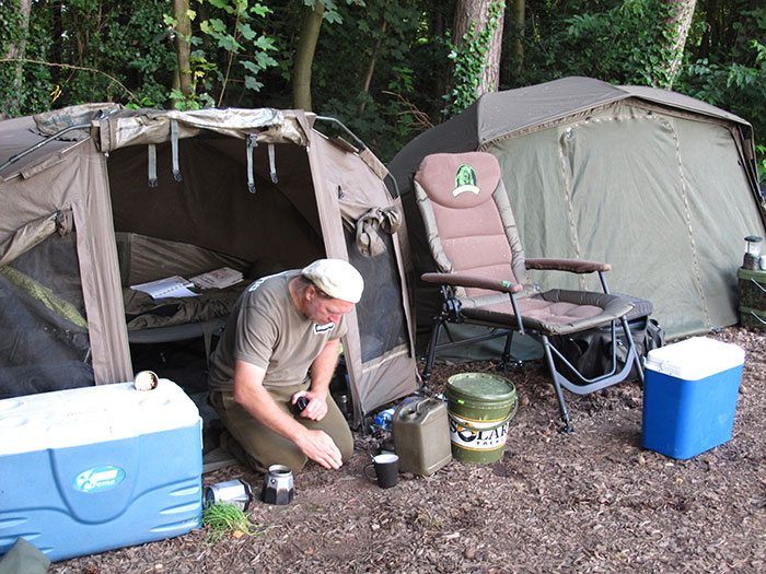 Wanneer ook John zijn rigjes naar behoren heeft gepositioneerd, arriveert Eddy met frieten en Bicky Burgers. Een traditionele, oer-Belgische maaltijd voor een ondertussen ook al traditionele gezamenlijke sessie. Na het eten vallen de eerste druppels regen uit de lucht en dat komt naar mijn gevoel niet ongelegen. Het gevolg is dat we nu wel moeten gaan schuilen in de bivvy en dan kan wat mij betreft ook het kacheltje aan. Ik heb zopas van John geleerd dat Kronenbourg een Frans bier is. Heel m’n leven al was ik in de veronderstelling dat dit een Nederlandse pils is, tot nu dus. Een overschotje van een trip naar het land van kaas en stokbrood, zo blijkt. Weer een wijsheid rijker.