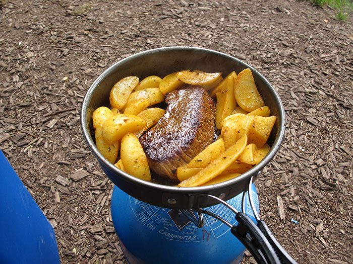Dat zomerse genot fungeert als achtergrondmuziek bij enkele gesprekken. Ook al spreken Alijn en ik elkaar regelmatig, zijn we met z’n tween steeds op n of andere in de weer voor ’t VBK en e-mailen we quasi dagelijks, je hebt altijd wel wat bij te praten, wat themaatjes om boompjes over op te zetten. De karperwereld is dan ook een boeiend biotoop vol snuiters van velerlei allooi. Tussendoor bak ik m’n biefstukje – Argentijns, voor de fijnproevers – ,verwarm ik de voorgesneden partjes barbecue-aardappeltjes en open ik een potje appelmoes, terwijl Alijn aan de eend gaat. Zelf gevangen. Die eend bedoel ik dan. Laat tien passanten punten geven op het culinaire, en ik win geheid! Met een voldaan gevoel rits ik een uurtje voor middernacht het muskietennet van de brolly dicht.