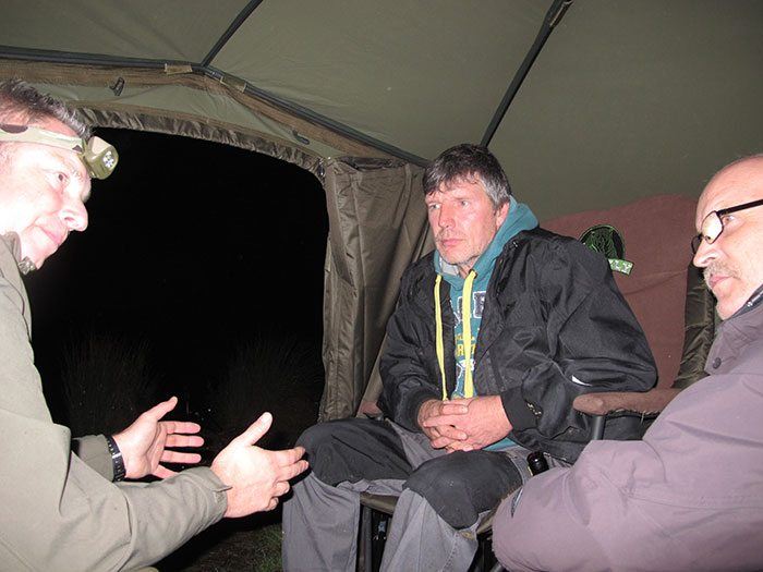 “Ik moet er ook maar eens aan beginnen,” sprak John toen we het hadden over welke hoofdstukken al aangeleverd zijn, en welke nog niet. “Zelf moet ik ook nog de eerste letters schrijven,” stelde ik hem gerust. John gaat voor zijn eigen bijdrage terug naar de jaren ’90. Naar zijn jacht op de Leder van Hofstade. Mijn verhaal situeert zich bijna twintig jaar later in de tijd, toen ik op Sinterklaasdag van 2013 Bizon mocht omarmen. De andere hoofdrolspelers van het op stapel staande boek hou ik nog even voor mezelf, maar het is een allegaartje aan karpers uit vier verschillende decennia, van kanaalvissen tot plas- en syndicaatbewoners. Verschillende watertypes die samen de blauwdruk vormen van onze Vlaamse visgronden. Voor zij die van karperboeken houden: op de VBK-Meeting van 2017 zal deze boven het doopvont worden gehouden, om ‘m meteen daarna te slijten aan al wie er eentje wil. Zover zijn we echter nog niet. Nu wordt er gevist en na een avond met z’n vieren in m’n brolly (ook Marc kwam poolshoogte nemen, dat heb je in een sociale club) snak ik letterlijk naar een beetje slaap. John, Eddy en Marc vinden het een uurtje na mijn zwanenzang ook welletjes en zoeken ook elk hun bedstee op.