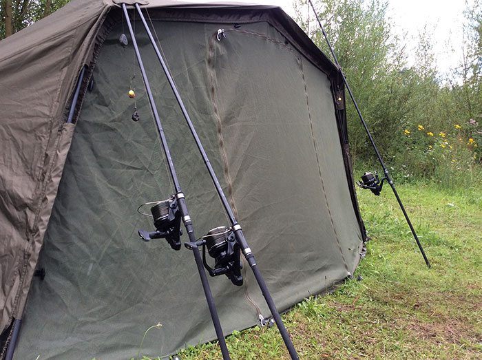 Door de regen wordt er geschuild in de bivvy. Gezelligheid staat voorop bij deze sessie!