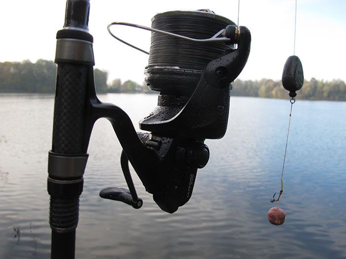 Met het verstrijken van het midden van de sessie, pas ik n van de drie montages aan. De aanwakkerende wind dwars over de plas doet me besluiten de chod te vervangen door een steviger rig, beaast met een in Aminol gesoakt FU5-dumbeltje, met daarbovenop een plastic maiskorreltje voor de visuele prikkel. Het loodgewicht wordt quasi verdubbeld tot honderddertig gram, en ook deze hoofdlijn leid ik nu met een backleadje langs het kanttalud aan de overkant. De andere rigs krijgen een grondige inspectie van de haak en worden opnieuw beaast.
