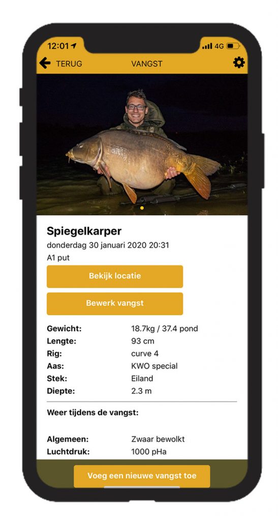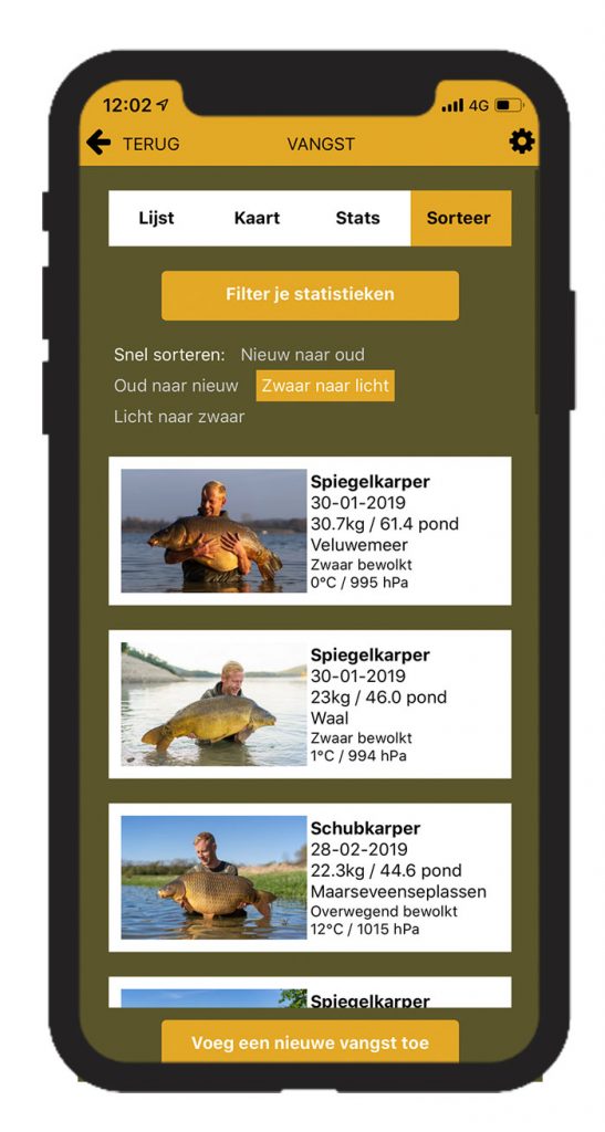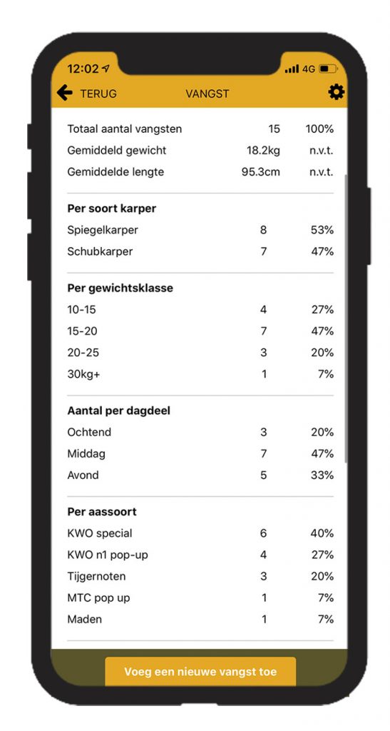 Hierdoor zie je na verloop van tijd niet alleen in een handomdraai welk aas of welke stek het beste presteert, maar ook het gemiddelde gewicht van je vangsten en bijvoorbeeld het percentage schubs/spiegels die je hebt gevangen!