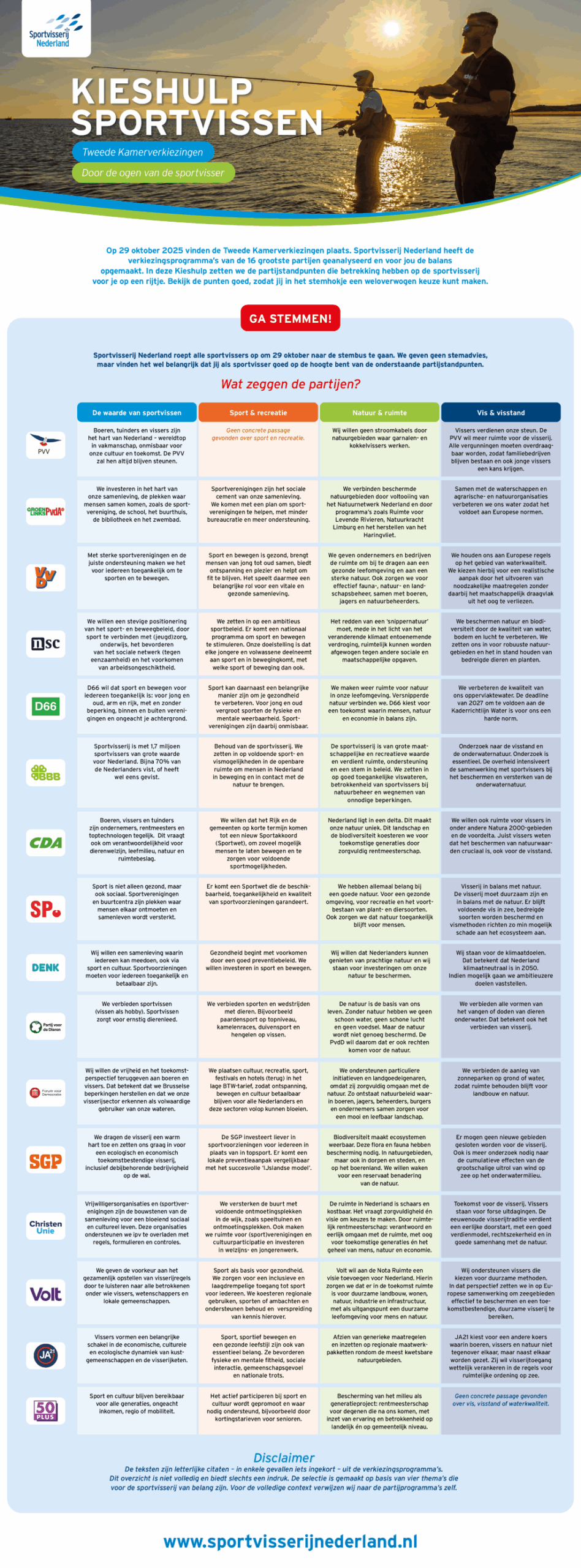 Sportvisserij Nederland heeft goed gekeken naar de verkiezingsprogramma’s van de 16 grootste politieke partijen en de belangrijkste dingen heel handig op een rijtje gezet. Met deze speciale ‘Kieshulp Sportvissen’ kun je alle standpunten goed bekijken zodat je op 29 oktober een goede keuze kunt maken. Bekijk ‘m hieronder en HIER in PDF…