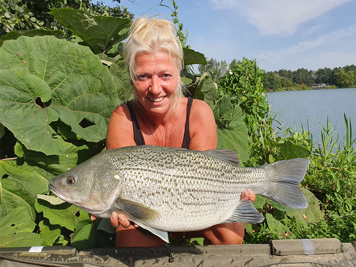 Mariëtte ving een Striper Bass. Daar hadden we nog nooit van gehoord, maar wat een mooie vis! Wat extra bijzonder is aan de vangst: er zwemmen er slechts acht rond op het water.