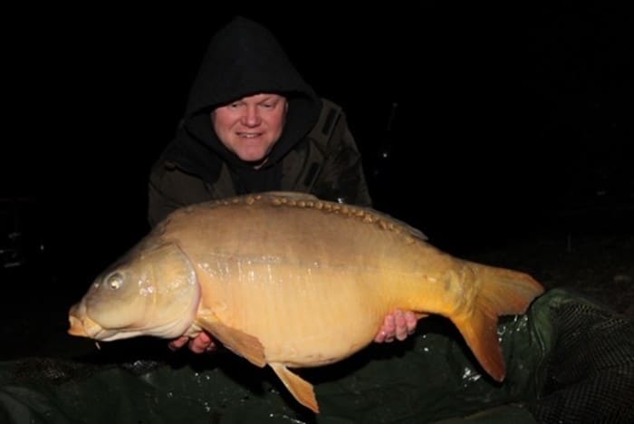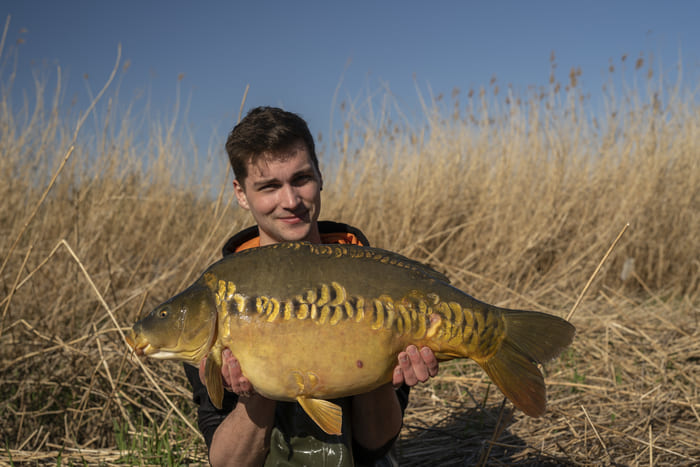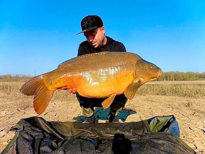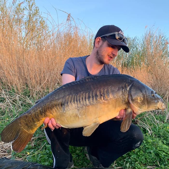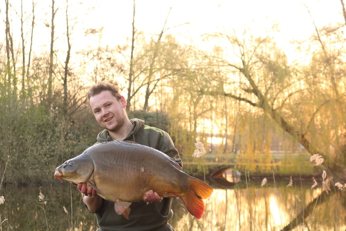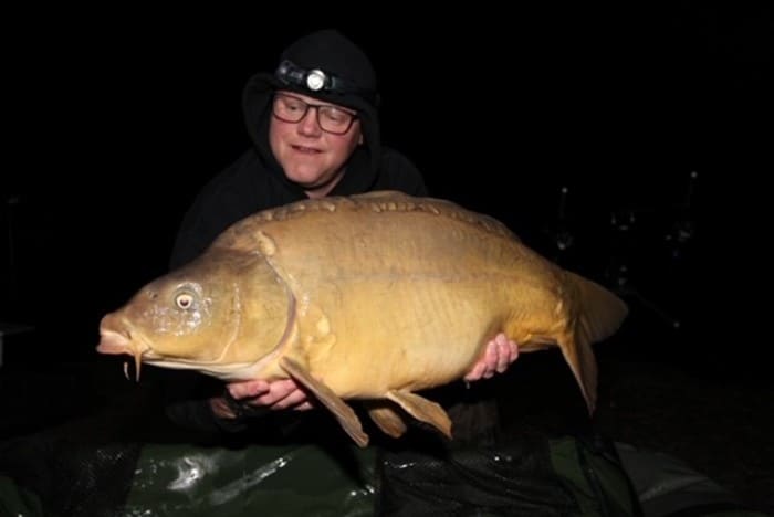 Leroy vertelt: De ochtend voordat ik ging vissen hoorde ik dat er een hele bijzondere vis zou moeten zwemmen, alleen wist m’n maatje Leon van der Graaf niet heel zeker of deze er nog zwom… ’s Avonds ben ik gelijk gaan zitten en rond 12 ’s nachts krijg ik een snoeiharde run! Na een met adrenaline gevuld gevecht, schep ik in het donker een silhouet van een karper het net in. Ik til het net uit het water en voelde gelijk al dat het een dertiger moest zijn. Het licht van de maan schijnt op de flank van de vis en ik begin spontaan te juichen!