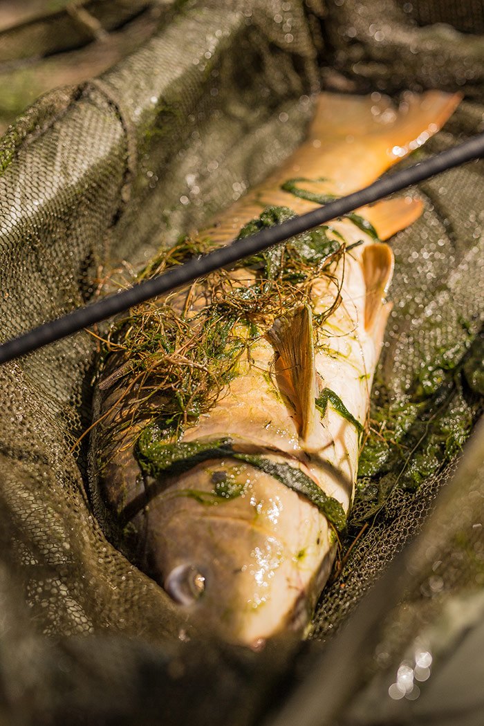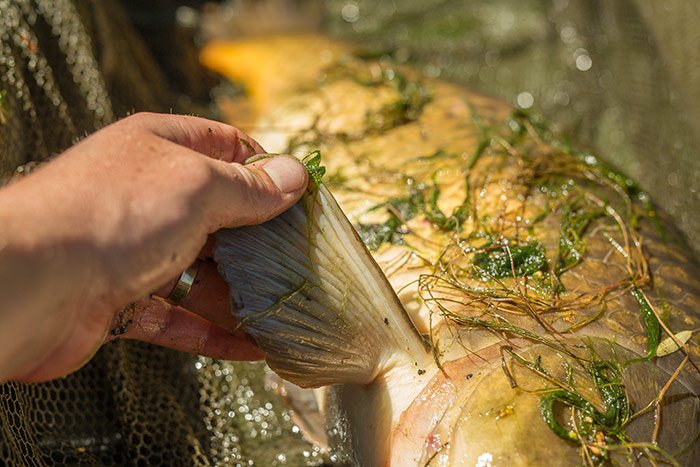 Voordat de karper op de gevoelige plaat kon worden vastgelegd, moest deze eerst even werden ontdaan van het nodige wier.