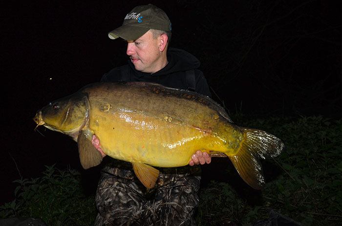 “Alles werd opnieuw in positie gelegd en toen ik net klaar was begonnen de hemelpoorten zich te openen. Langzaam viel ik in slaap om rond de klok van 02.30u door een keiharde fluiter op de andere hengel gewekt te worden. Deze vis had duidelijk meer te vertellen als zijn broertje een paar uur geleden. Het waadpak aantrekken verliep al even zo moeizaam als het verkrijgen van controle over de vis. Uiteindelijk slaagde ik in beiden en lukte het me om het net onder een massieve spiegel te schuiven.”