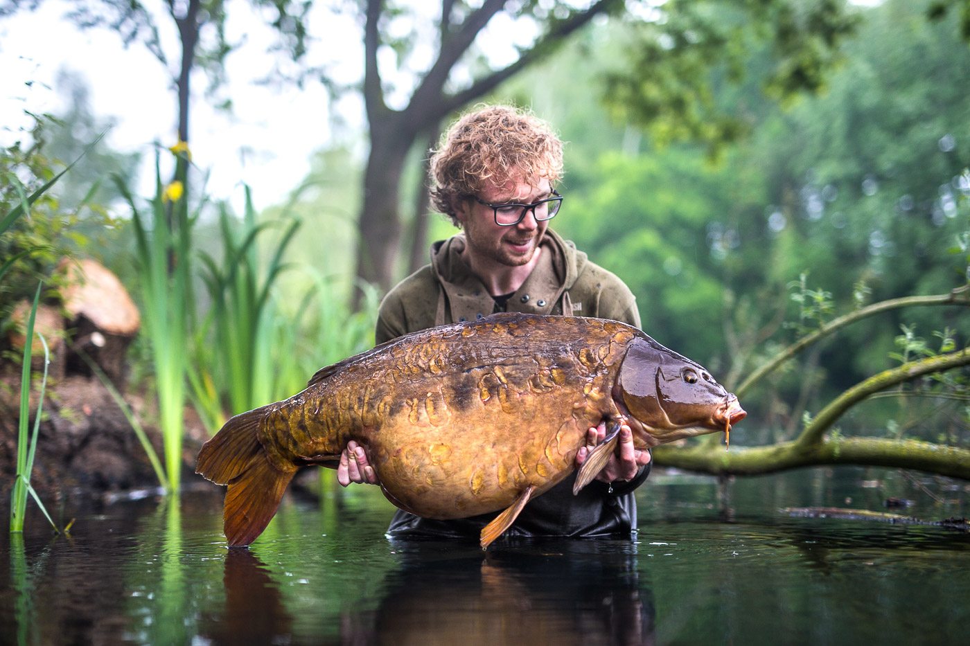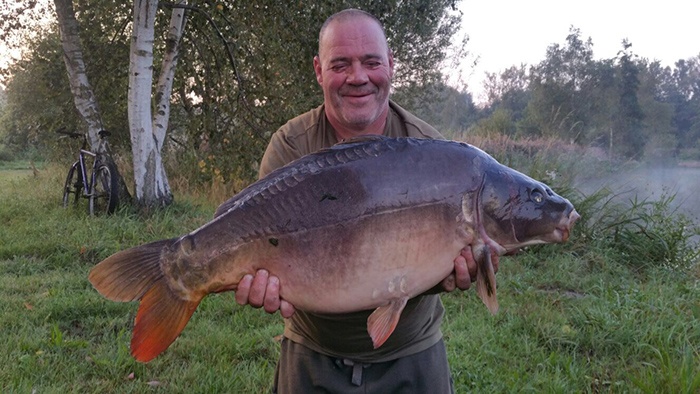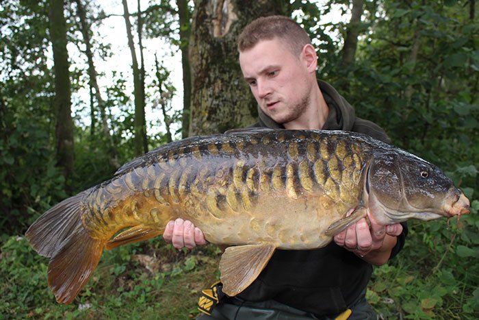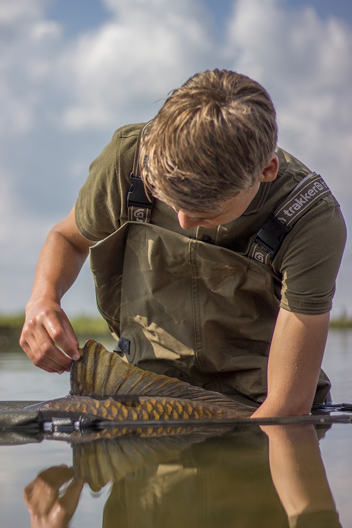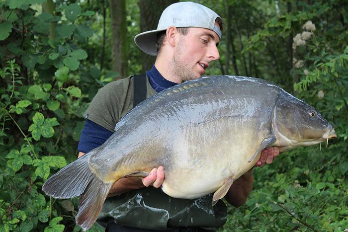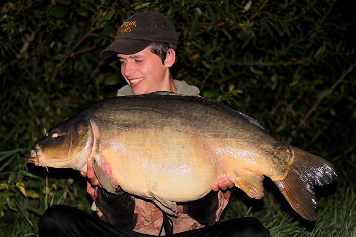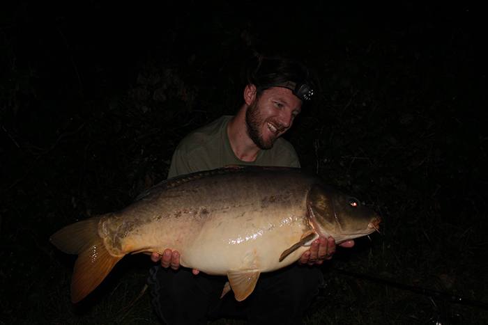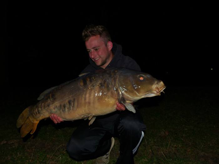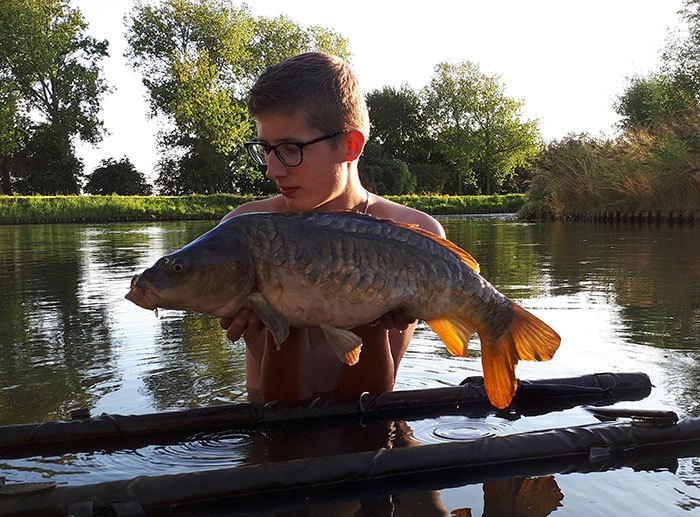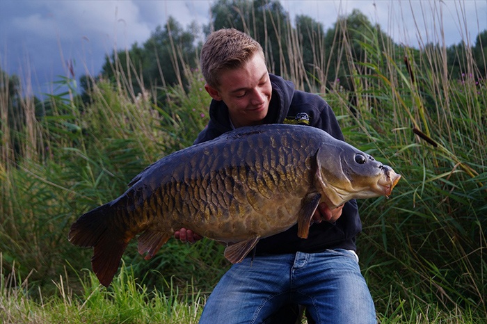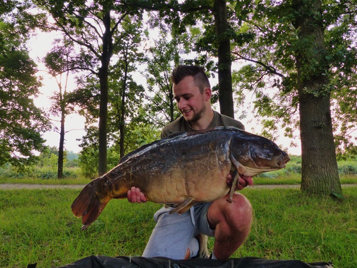 Tim aan het woord: Als ik ’s middags naar mijn stek fiets voor een nachtje vissen begeeft mijn kar het waardoor ik het laatste stuk moet lopen. Niet bepaald een vliegende start op deze manier… Gelukkig liggen de hengels al snel in en als Frank ’s avonds even langs komt vliegt de eerste hengel er met een keiharde run vandoor. Het duurt niet lang of er ligt een dikke spiegel in mijn net. Mijn nacht kan al niet meer stuk!