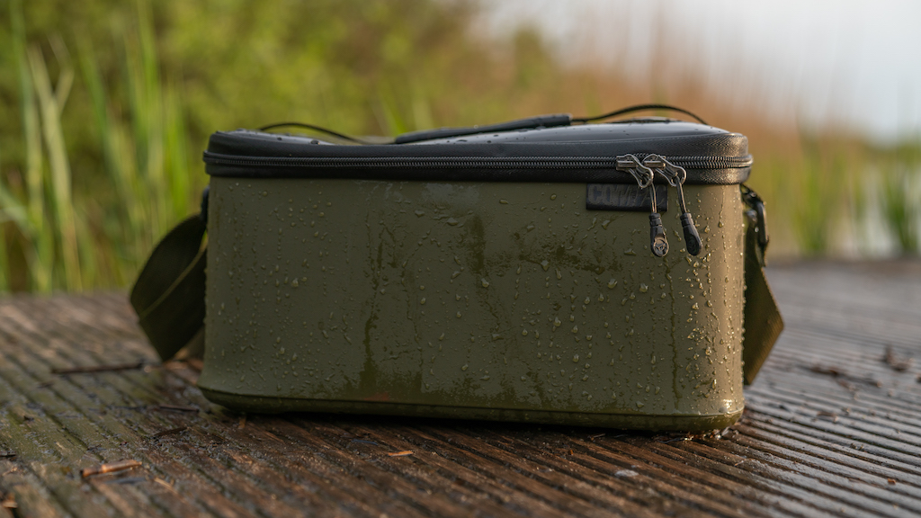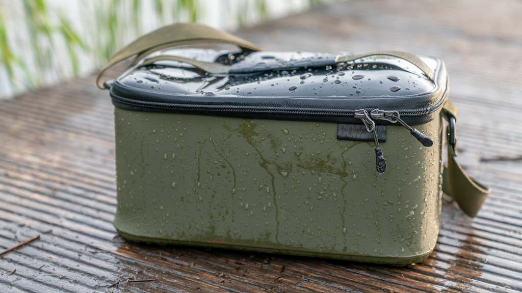 Nadat ik de tas in ontvangst had genomen heb ik hem direct uitvoerig getest. De eerste sessie viel er veel regen. In mijn visserij vind ik het belangrijk om zo licht en compact mogelijk op pad te gaan, dus dat houdt in dat ik vaak alleen een paraplu of brolly meeneem zonder grondzeil. Voor mij is het dan ook heel belangrijk dat de tas vanaf onderen ook waterdicht is, zodat deze op de ondergrond kan staan zonder dat er vocht in komt. De onderzijde is uit één stuk gegoten, waardoor een natte ondergrond absoluut geen probleem is. Verder is de tas aan de bovenzijde uitgevoerd met een waterdicht deksel waardoor een bui of condens geen problemen oplevert.