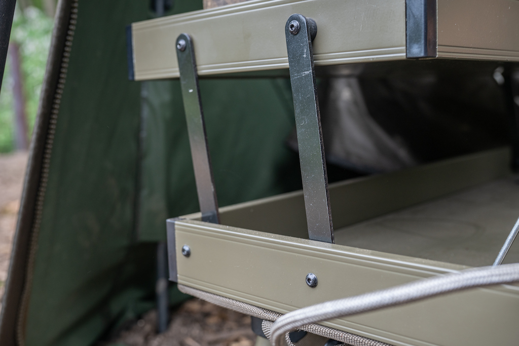 De Double Decker Bivy Table is de eerste van haar soort, met twee lagen waarin je al je belangrijke items op kunt bergen. Houd je persoonlijke spullen gescheiden van je belangrijke artikelen voor het vissen, dit kun je doen door je persoonlijke items in de bovenste lade op te bergen, terwijl je in de onderste voldoende ruimte hebt voor je artikelen voor het vissen. Het bovenste gedeelte bevat een strook langs de achterste rand die gebruikt kan worden om je tablet of telefoon in te plaatsen, zodat je hierop, bijvoorbeeld, een video kunt bekijken.