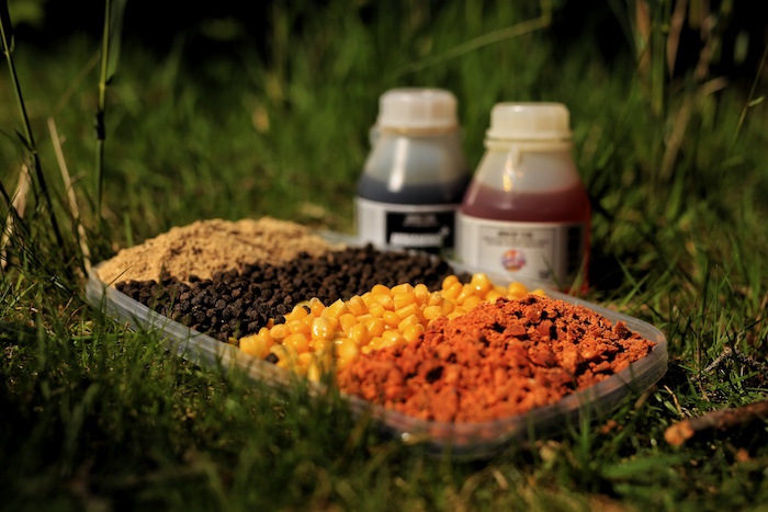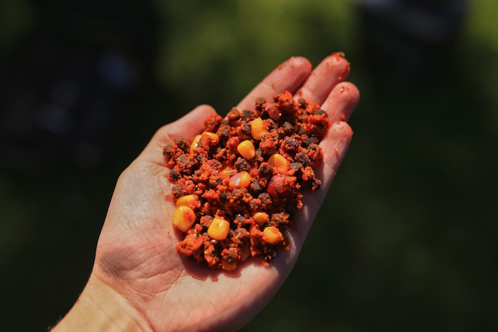 Als voorkeur gaat mijn type aas in voorjaar uit naar een iets zoetere boilie/variant hiervan, om deze reden kies ik er dan ook voor om met de Vitella boilie aan de slag te gaan als basis. Aan die basis voeg ik graag nog enkele andere aasjes toe zoals zoete blikmais, D-Cell pellets en grondvoer in dezelfde soort als mijn basisboilie. Ik zorg er ook voor dat er geen grote voedseldeeltjes in het aas zitten om verzadiging te voorkomen. Om de mix met het grondvoer aan te mengen maak ik geen gebruik van water maar ook hier kies ik weer voor de attractiefste optie. De nieuwe Minamino+ in combinatie met de Vitella dip zorgen ervoor dat er een ware geur/smaak explosie onderwater te vinden is die de karper tot azen kan aanzetten.