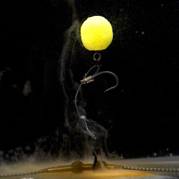 Als haakaas kies ik tijdens deze periode graag voor een visueel opvallend maar bovenal een klein aasje, dit kan een kleine 12mm pop up zijn of twee stukjes fake food mais op een 12cm korte rig. De visuele gele prikkel met de andere mais in de mix maken de karper nieuwsgierig genoeg voor een aasopname en heeft mij dit voorjaar enkele hele gaven vissen opgeleverd.