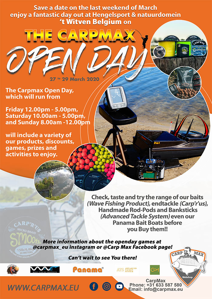 Zet ‘m vast in je agenda: tijdens het laatste weekend van maart organiseert Carpmax fantastische open dagen op het domein van ’t Witven in België! Het evenement vindt plaats op vrijdag van 12:00 tot 17:00, op zaterdag van 10:00 tot 17:00 en op zondag van 08:00 tot 12:00. Tijdens de open dagen kun je de producten van Carpmax bekijken, korting scoren, games spelen, prijzen winnen en deelnemen aan diverse activiteiten!