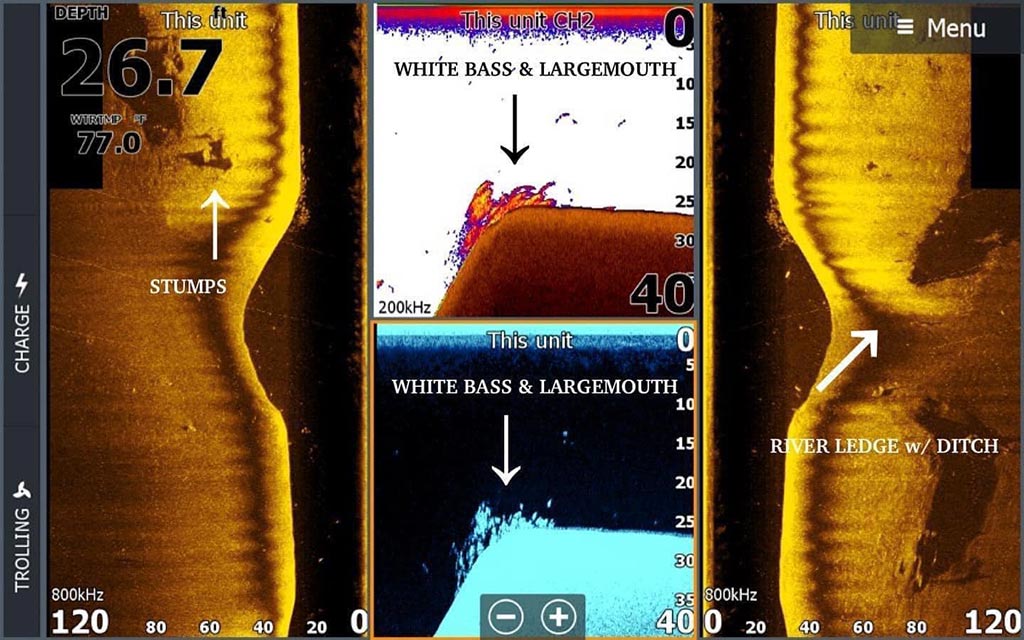 Lowrance: Split Screen Power! Met de 3 in 1 Active Imaging Transducer & HDS Live krijg je enorm veel waardevolle informatie in één blik in je scherm. In het beeld hieronder zie je zowel de linker- en rechterzijkant met de SideScan, maar tegelijkertijd speur je de bodem onder je boot af met de traditionele sonar én CHIRP functie. Hoe vet is dat!