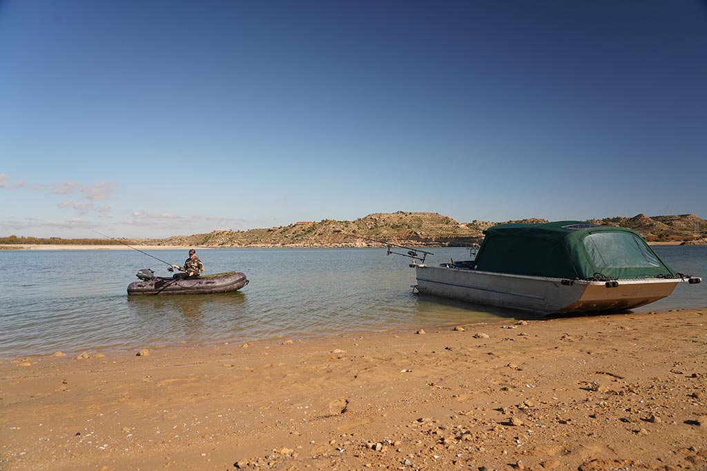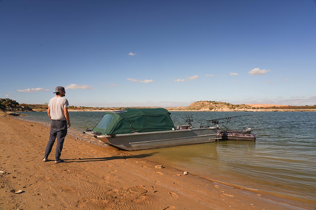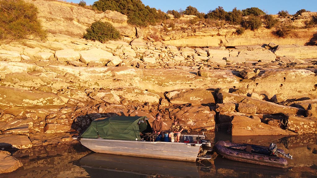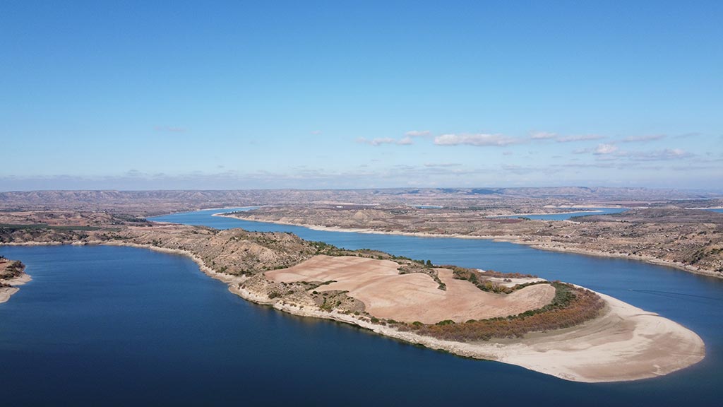 De boot wordt getrailerd halverwege het grote stuwmeer. Dit betreft het heldere gedeelte met mooie lange schiereilanden in de binnenbochten zoals je op de drone foto kunt zien. We vermijden het deel van “Caspe” omdat je lekker de wildernis in wil. Het voelt ruig en wijds aan en heeft tegelijkertijd iets spannends!
