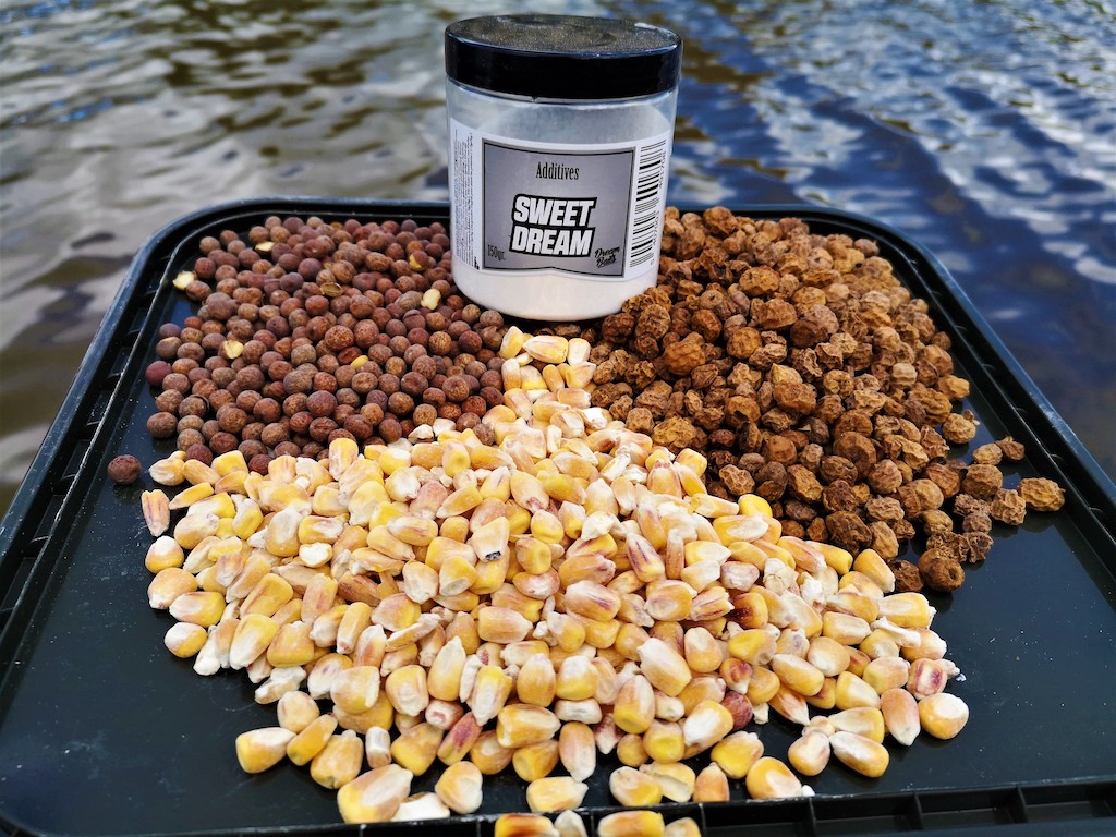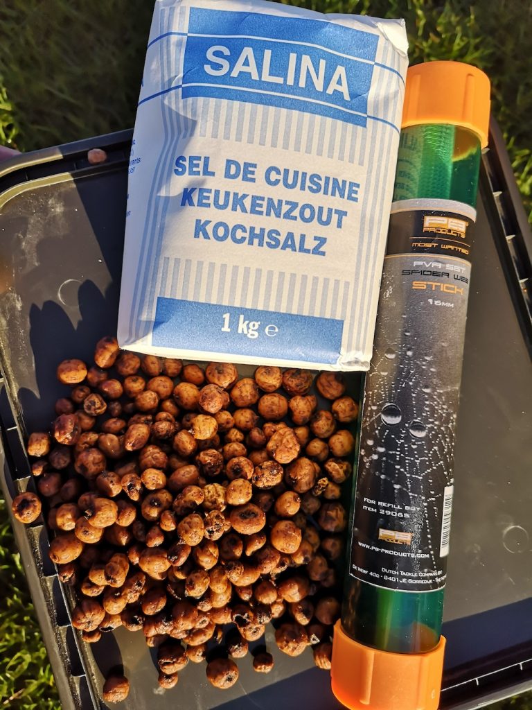 Alle partikels zijn van zichzelf al zeer attractief en hebben geen extra opsmuk nodig om karper te vangen. Toch zijn er een paar zaken die ikzelf graag inzet. Met stip op nummer één is een goede sweetner. Deze voeg ik toe aan het water waarin ik de partikels week en kook. Hierdoor trekt de sweetner diep in het aas en ik merk dat dit zeker een meerwaarde is in je visserij. Met name tijgernoten, maples, pinda’s en mais zijn hiervoor zeer geschikt. Goede sweetners zijn die op basis van NHDC, talin of sacharine. Zout is ten alle tijden ook een goede, bij hennep voeg je dat pas toe na het koken omdat de zaadjes anders niet of slecht kiemen.